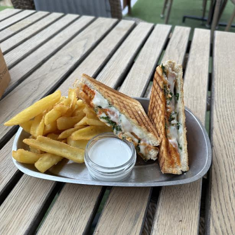 Tripla szeletes toast bazsalikomos- szárított paradicsomos krémmel, bivaly mozzarellával, rukkolával és sült csónakburgonyával.