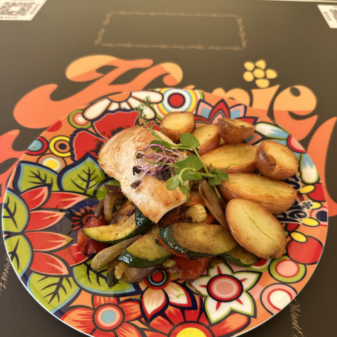 Fűszeres grill csirkemell pirított petrezselymes parázsburgonyával és vajon őszi pirított zöldségekkel.