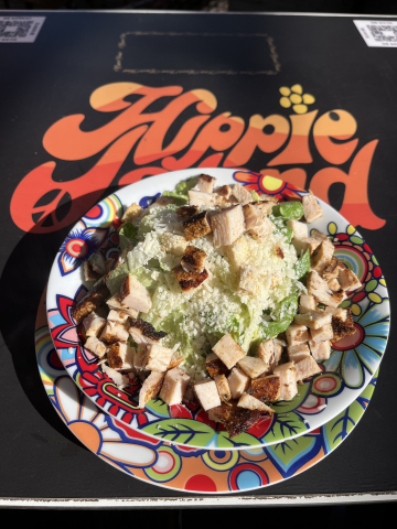 Római saláta, jég saláta, cézár dresszing, csirkemell, fűszeres ropogós