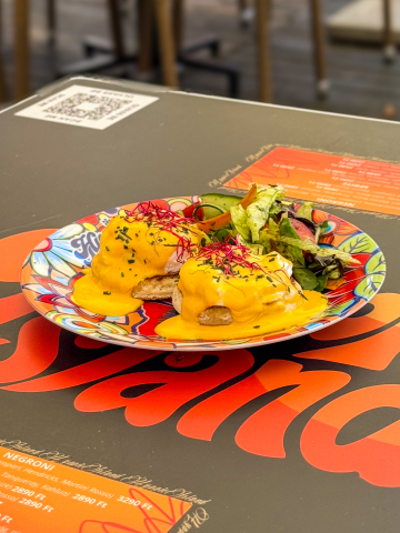 Pirított briószsemle sült sonkával, lágyan főzött buggyantott tojással és gazdag hollandi mártással tálalva.
