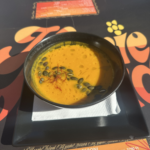 Sütőtökkrémleves kókusztejjel, tökmaggal és tökmagolajjal tálalva.