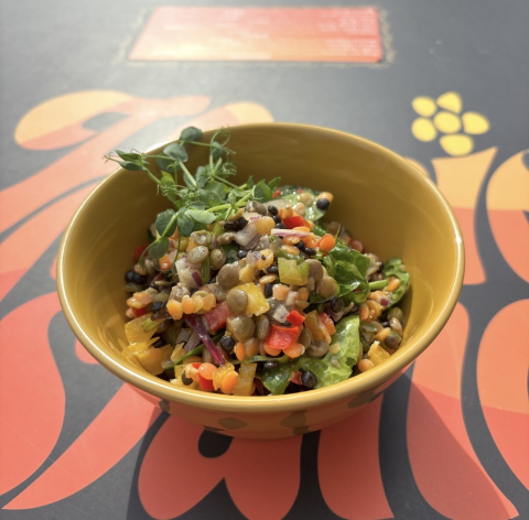 Három féle lencséből készült, apróra vágott kaliforniai paprikával, lilahagymával és olívaolajos - mustáros dresszinggel készült saláta.