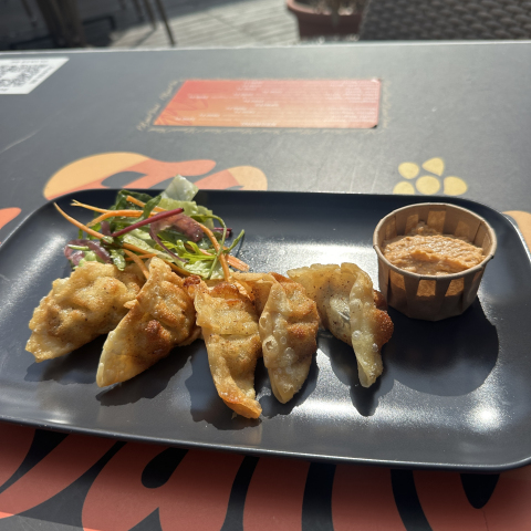 Csirkehússal és zöldséggel töltött sült tészta, pikáns kókusztejes - mogyorós mártógatóssal.