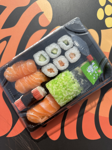 2 db kaliforniai tekercs, 3 db uborka maki, 3 db lazac nigiri, 1 db surimi nigiri, 3 db lazac maki, szójaszósz, gyömbér, csípős torma.