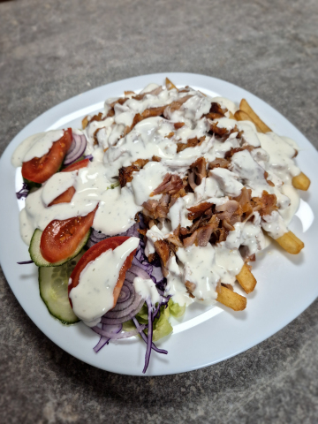 Friss, ínycsiklandó csirke hús, friss zöldségek (saláta, lilakáposzta, lilahagyma, paradicsom, uborka), ropogós hasábburgonya, fokhagymás-kapros öntety illetve igény szerint csípős szósz.