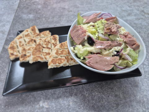 Uborka, paradicsom, saláta, lilahagyma, olivabogyó, tonhal, citrom, majonéz, bazsalikom