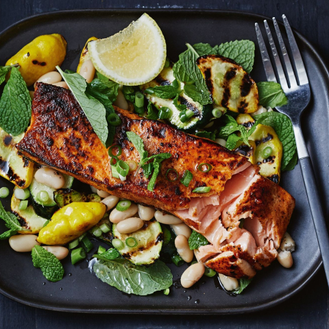 Salmon, olive oil, lemon, rosemary, thyme, garlic, sea salt