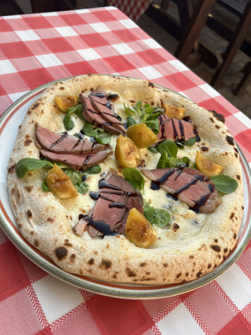 75. ANATRA – Cheese Cream Base, Mozzarella, Gorgonzola, Topped After Baking with Pink-Roasted Duck Breast Slices, Fig, Lamb’s Lettuce, and Balsamic Cream