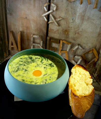 Spinach Soup with Poached Egg and Parmesan Croutons