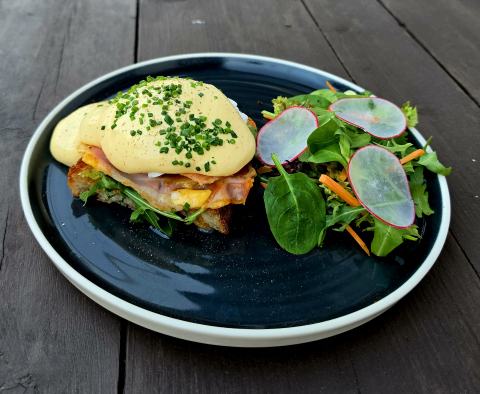 EGGS BENEDICT - 2 tojásból, vadkovászos pirítóssal, hollandi mártással, friss salátával, sült szalonnával