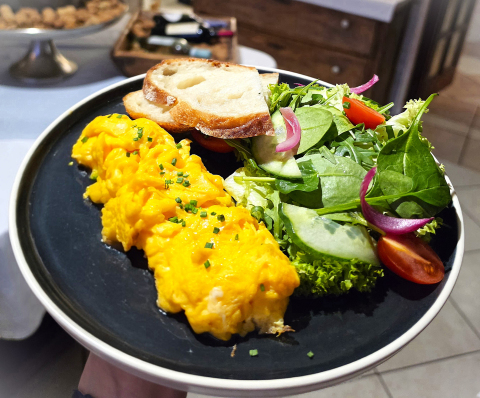 Rántotta (2 tojásból), kovászos kenyérrel, friss salátával